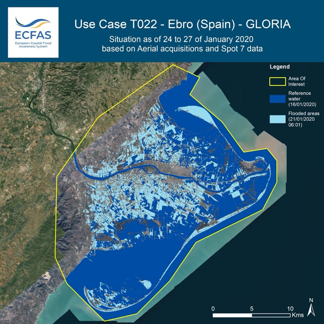 Last year, several storms affected European coastlines, from the North Sea to Mediterranean countries. Storms Gloria, Ciara, Dennis and Brendan caused significant damage, extensive flooding and the erosion of coastal areas across Europe, from the Mediterranean to the Northern Atlantic and the North Sea. The Ebro Delta in Spain suffered flooding up to 3 km from the coastline with 30 square kilometers of rice fields destroyed and causing an estimated loss to the national economy of several million euros. This impressive sequence of disasters highlighted the urgency of implementing an operational system at the European scale, able to provide useful and timely information on coastal flood risk from extreme sea level events, for preparedness, response and recovery purposes.